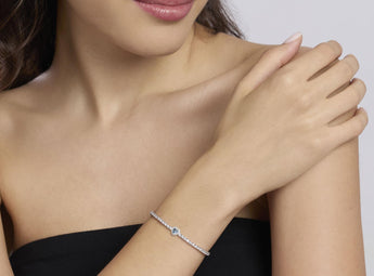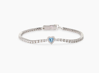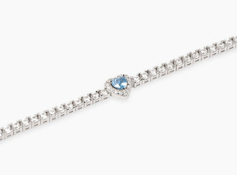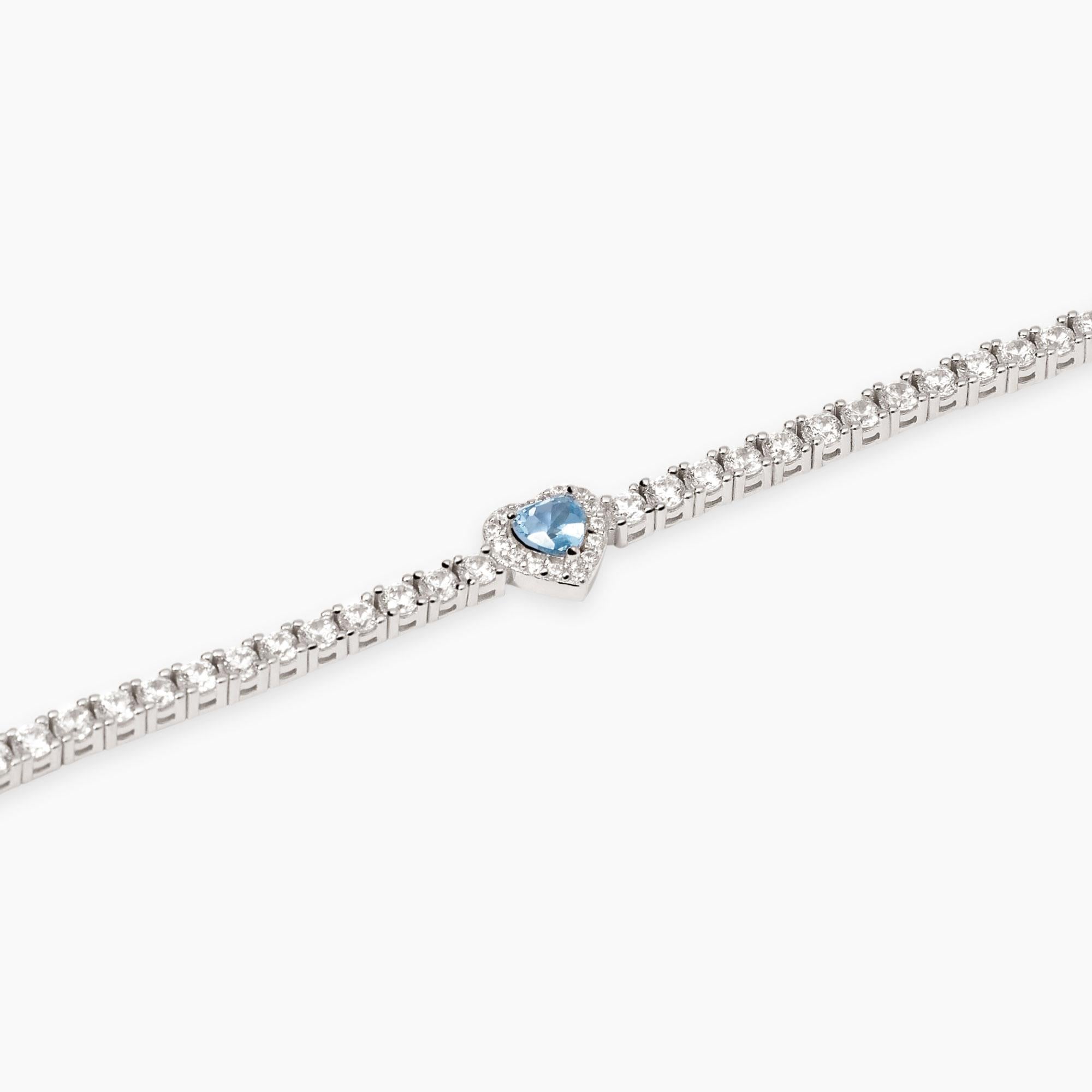 Bracciale tennis in argento rodiato con zirconi bianchi e acquamarina sintetica taglio cuore.