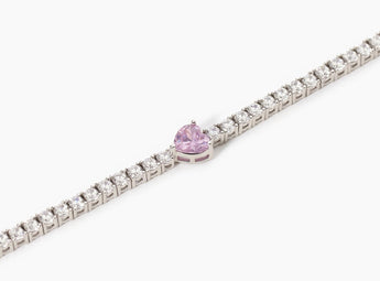 Bracciale tennis in argento con zirconi e cuore in zircone rosa.