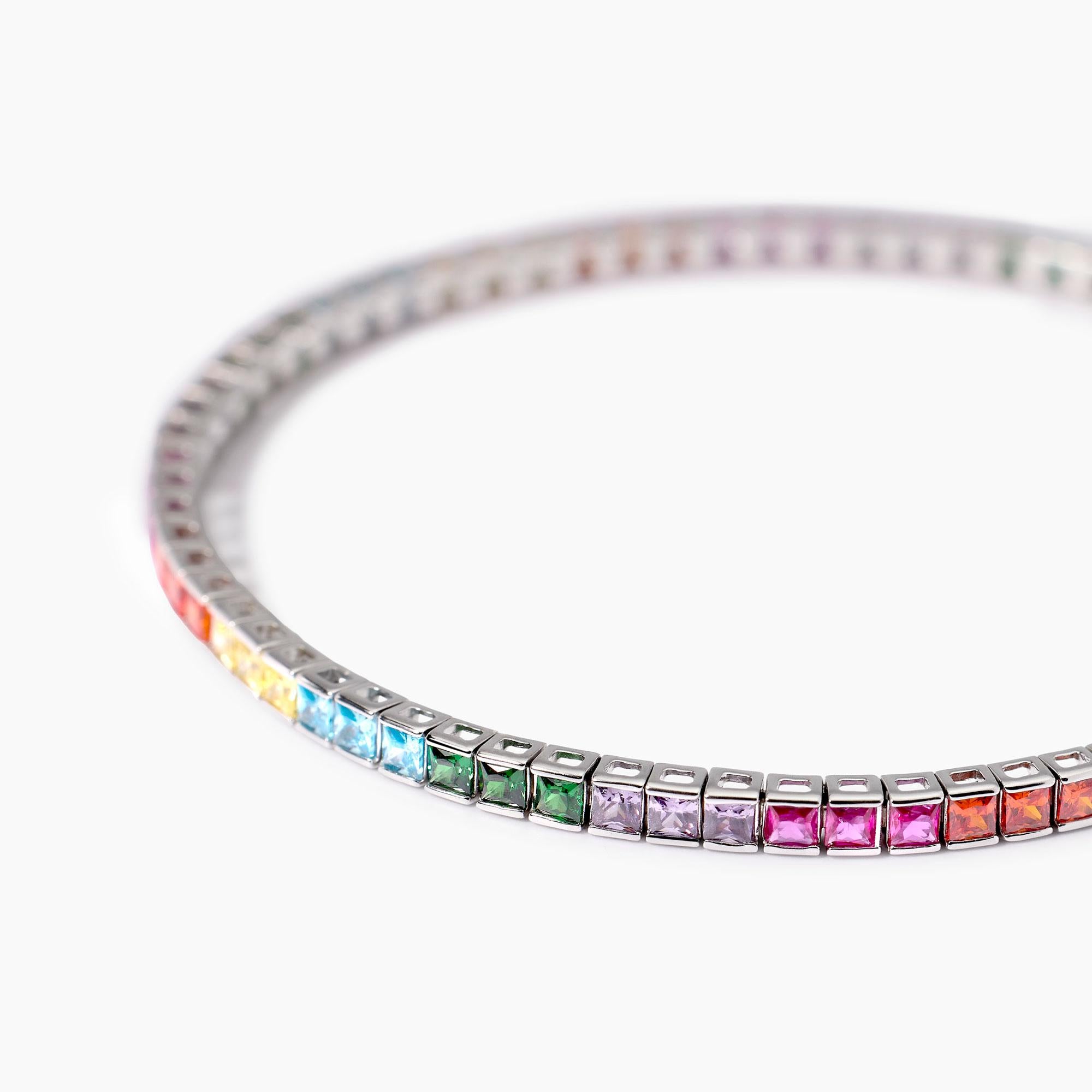 Bracciale tennis regolabile da donna in argento rodiato con zirconi multicolor taglio princess.