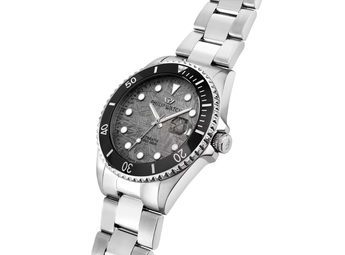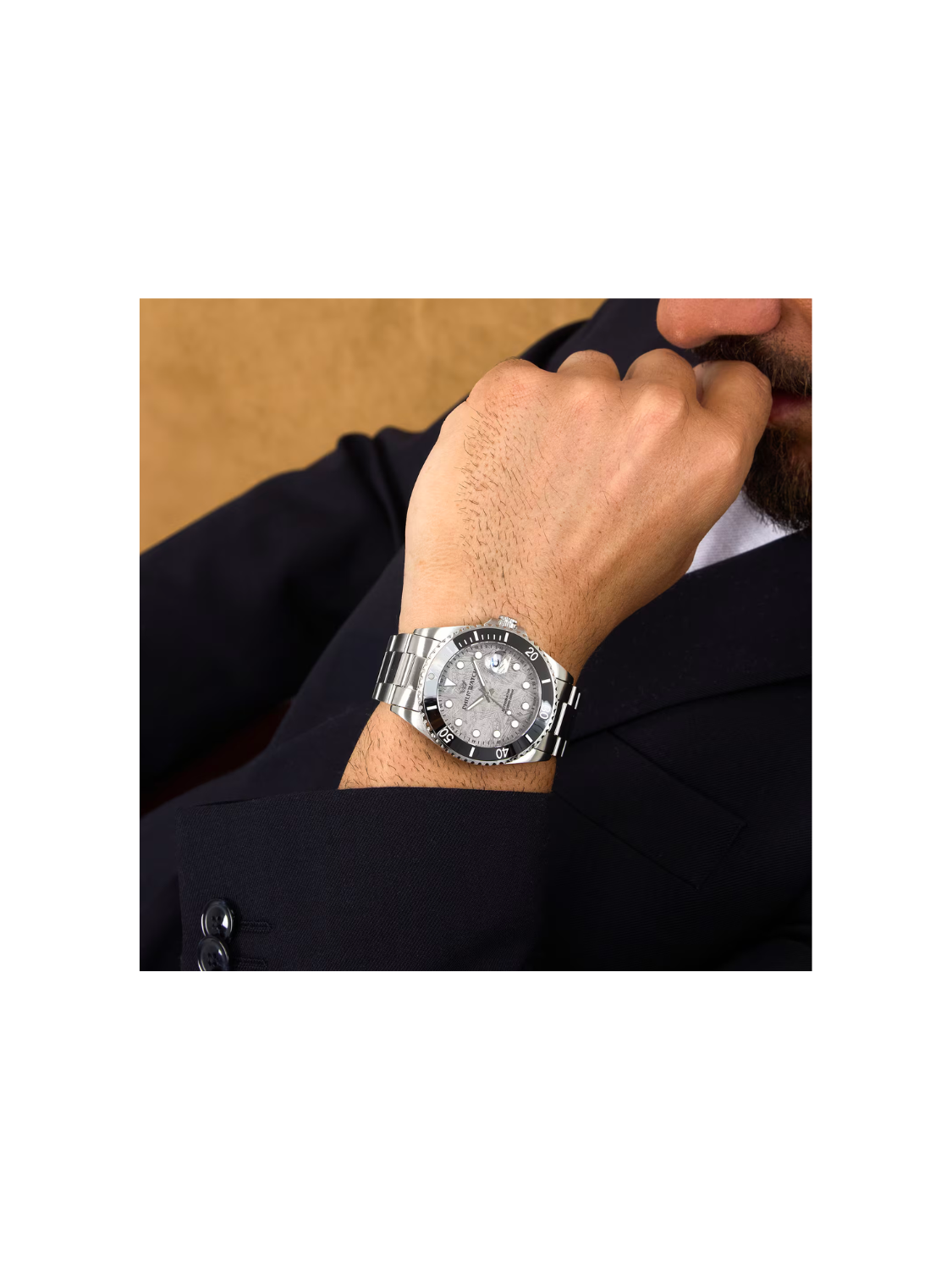 Il protagonista assoluto è il quadrante meteorite, un dettaglio unico nel suo genere: ogni venatura racconta una storia irripetibile, rendendo ogni esemplare esclusivo e diverso da qualunque altro. A completare il design si trova il bracciale in acciaio inox, resistente, luminoso e capace di conferire un tocco di eleganza versatile.