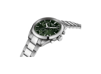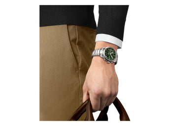 Il quadrante verde soleil è impreziosito da indici e lancette argentati rivestiti in Super-LumiNova, creando un contrasto sottile ed elegante.