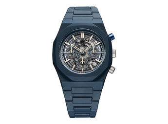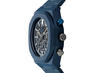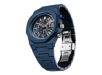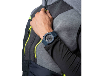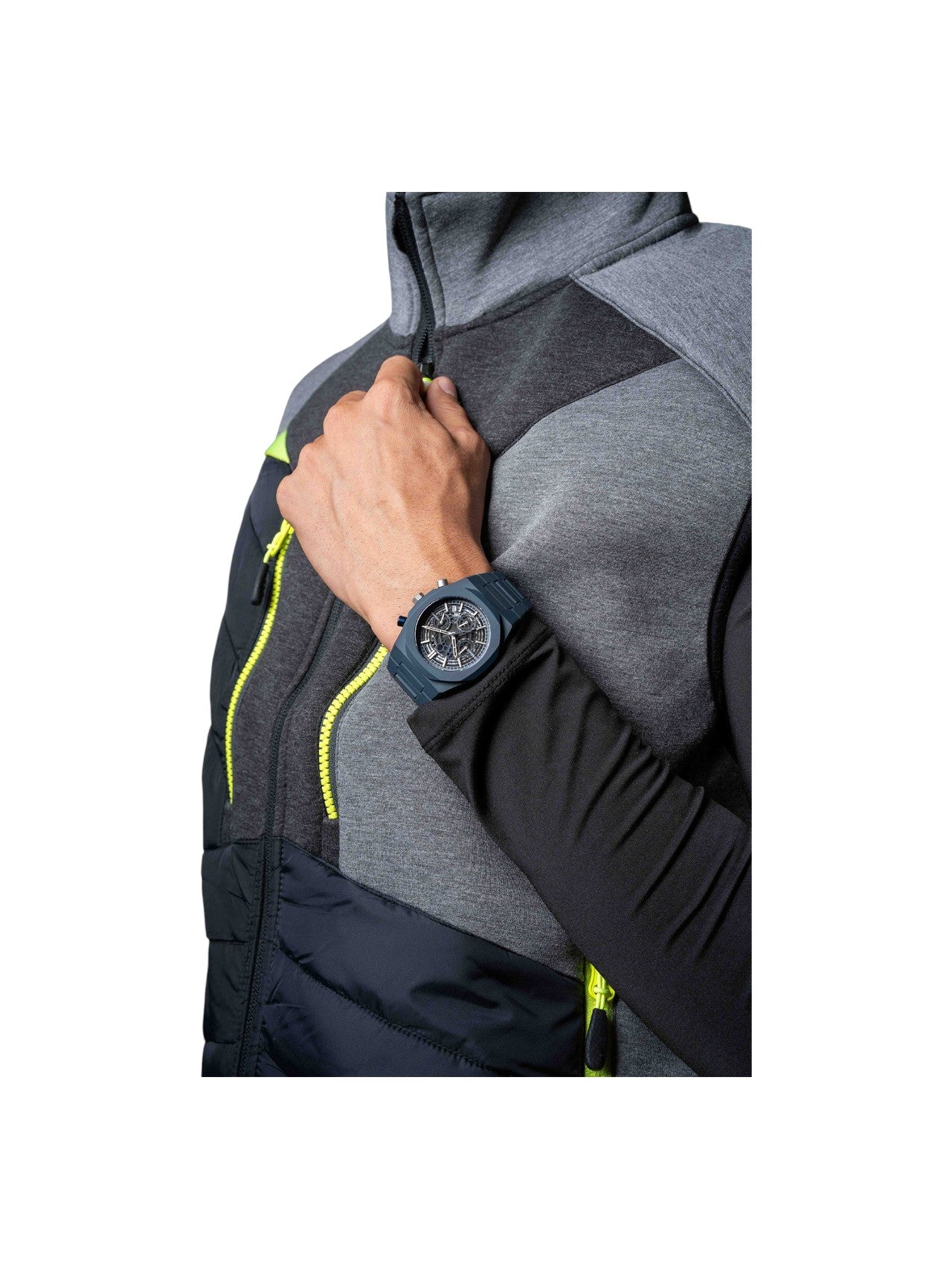 Il quadrante è l’elemento distintivo del modello: una struttura scheletrata tono su tono che svela parzialmente la meccanica sottostante, creando un affascinante gioco di profondità e trasparenze. I contatori del cronografo si integrano perfettamente nel disegno multilivello, con indici minimalisti e dettagli blu scuro sulle lancette che garantiscono un contrasto visivo dinamico e sportivo. Il tutto è incorniciato da un rehaut pulito, che rafforza la lettura e l’armonia dell’insieme.