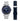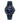 Quadrante analogico blu con indici a bastoni e datario con giorno del mese a ore 3 e della settimana a ore 12.